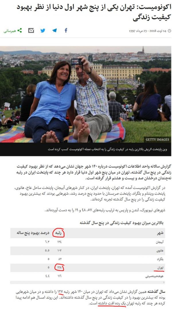 وقتی بیبیسی با انتخاب تیتر فریبنده، واقعیت را تحریف میکند: در گزارش سالانه اکونومیست از بهترین شهرهای جهان برای زندگی، تهران در میان ۱۴۰ شهر در رتبه ۱۲۸ قرار گرفته و حتی جایگاهش نسبت به سال قبل، یک رتبه سقوط کرده است. https://t.co/mvLnsNHb87