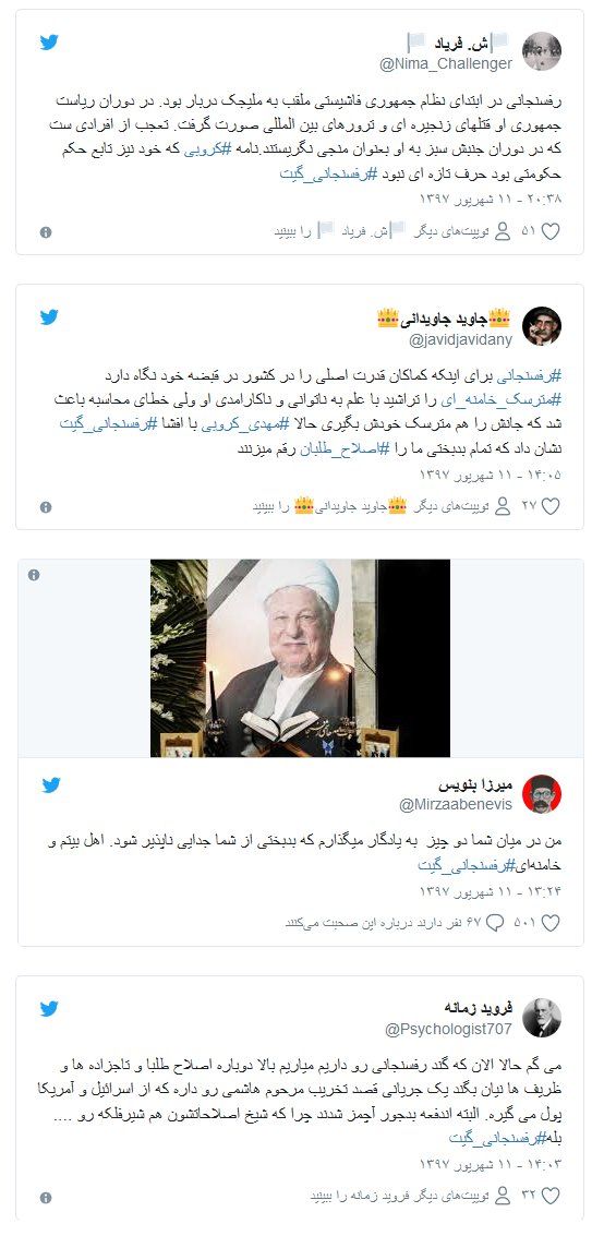 - کاربران فضای مجازی هشتگ (#رفسنجانی_گیت) را داغ کرده و پرسیدهاند: کروبی چرا در زمان حیات رفسنجانی سکوت کرد؟