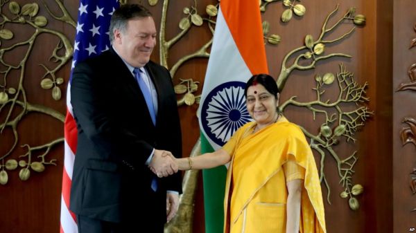 مایک پومپئو، وزیر خارجه آمریکا با همتای هندی خود، سوشما سواراج. ۱۵ شهریور ۱۳۹۷ یک مقام وزارت خارجه آمریکا اعلام کردهاست که در جریان سفر مقامات ارشد این کشور به هند، «مذاکرات مفصلی درباره جزئیات فنی قطع کامل خرید نفت ایران» انجام شدهاست.میاک پومپئو، وزیر خارجه، و جیمز متیس، وزیر دفاع ایالات متحده، روز چهارشنبه، ۱۴ شهریور، به هند سفر کردهاند.