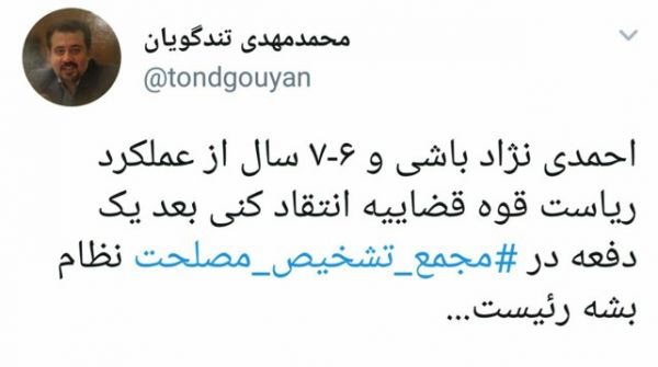 توییت محمد مهدى تندگویان معاون وزیر ورزش و جوانان درباره انتصاب آیت الله آملى لاریجانى به ریاست مجمع تشخیص مصلحت نظام.