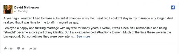 متیسون از تلاشهایش برای «درمان همجنسخواهی» عذرخواهی نکرد ولی در پست فیسبوکیاش نوشت: «در پایان دوره انکار، تازه فهمیدم رابطه صمیمی با یک مرد دیگر چیزی نیست که بتوانم از آن بگریزم. این تبدیل به یک نیاز انکارناپذیر شده بود».