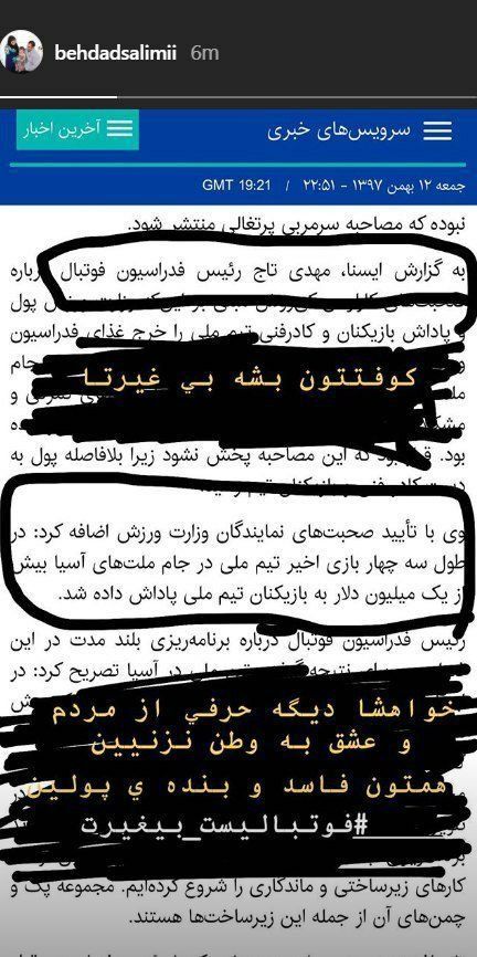 استوری عجیب بهداد سلیمی در واکنش به پاداش بازیکنان تیم ملی در جام ملت‌های آسیا