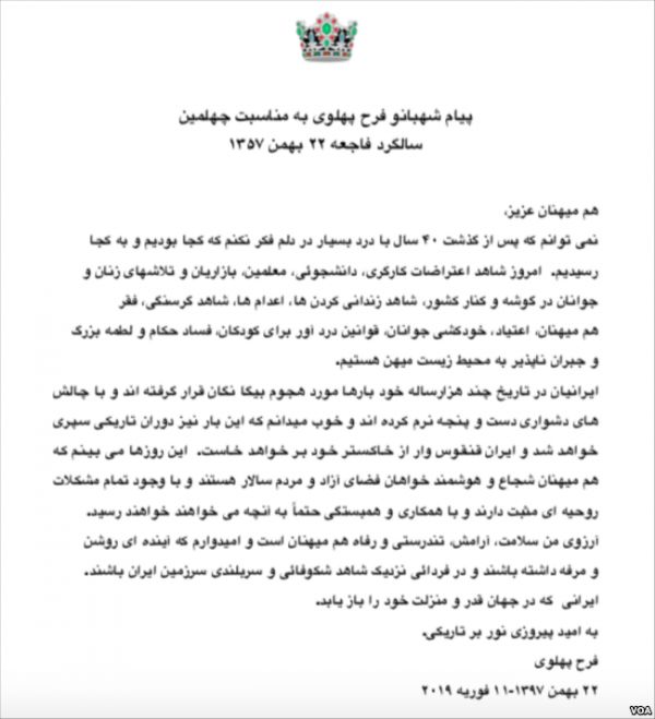 صدای آمریکا : شهبانو فرح پهلوی در پیامی به مناسبت چهلمین سالگرد انقلاب سال ۵۷، ابراز امیدواری کرد که ایرانیان اینبار نیز «دوران تاریکی» را سپری کنند و دوباره برخیزند.فایل صدای شهبانو فرح پهلوی به مناسبت «چهلمین سالگرد فاجعه» ۲۲ بهمن ۱۳۵۷