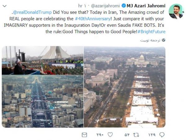 محمد جواد آذری جهرمی در توئیتی خطاب به دونالد ترامپ گفت: جمعیت واقعی مردم امروز را با جمعیت خیالی روز تحلیف خود یا اکانتهای فیک سعودی مقایسه کن.این یک قانون است: چیزهای خوب برای آدمهای خوب رخ میدهد.