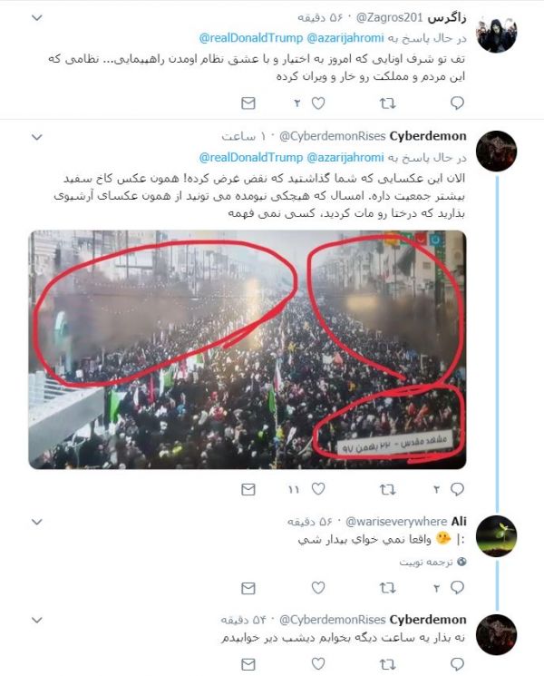 حالا ترامپ شاید گول بخوره ولی ما که تو همین جامعه و انقلاب فاسد رشد کردیم که میدونیم این جمعیت سازی ها چطوری هستش و یعنی شما واسه خودتون آزادی قائل هستید که از هرکجا جمعیت بیارید (آوردن 30 نفر از هر دبیرستان و اجبار معلمان و سربازها و کاردهای سپاه و حراستهای کارخانه ها و ادرات بخصوص از شهرستانها)واسه خیابون پرکردن ولی به مخالفان اجازه نمیدید یک روز آزاد باشند و به خیابانها بیاییند؟ ولی تو آمریکای ترامپ مخالفان هم آزادند که هر موقع خواستند به خیابانها بیاییند و به ترامپ یا هر کسی اعتراض کنند. تفاوت اینجاست
