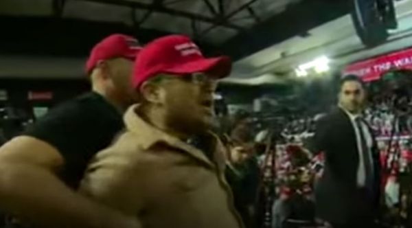 در جریان تجمع هواداران آقای ترامپ در شهر ال پاسو در تگزاس، یکی از حاضران که کلاه قرمز "ای جی ای" (شعار 'آمریکا را دوباره بزرگ کنیم') به سر داشت، ران اسکینز فیلمبردار بی بی سی را هل داد و به او فحاشی کرد.