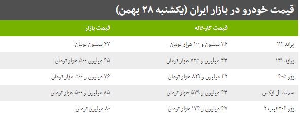 بی بی سی فارسی: با ادامه موج جدید افزایش قیمت خودرو در ایران، قیمت پراید ۱۱۱ امروز یکشنبه (۲۸ بهمن) به ۴۷ میلیون تومان رسیده و رکورد جدیدی را ثبت کرده است؛ قیمت این خودرو دیروز ۴۵ میلیون تومان بود.این افزایش قیمت در سایر خودروها هم مشهود بود بطوری که قیمت پژو ۲۰۶ تیپ ۲ با افزایش ۴ میلیون تومانی نسبت به دیروز، در بازار آزاد به ۸۰ میلیون تومان رسیده است.