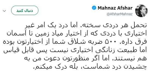 به گزارش خبرگزاری خبرآنلاین، مهناز افشار در واکنش به سخنان حسن نوروزی سخنگوی کمیسیون قضایی مجلس در توییتی نوشت: «تحمل هر دردی سخته. اما درد یک امر غیر اختیاری با دردی که از اختیار میاد زمین تا آسمان فرق داره. ۵۰۰ ضربه شلاق شما از اختیارتون بوده اما طبیعت زنانگی اختیاری نیست پس قابل قیاس هم نیستند. اما اگر منظورتون دعوت من به چشیدن درد شماست، بله درک میکنم.»