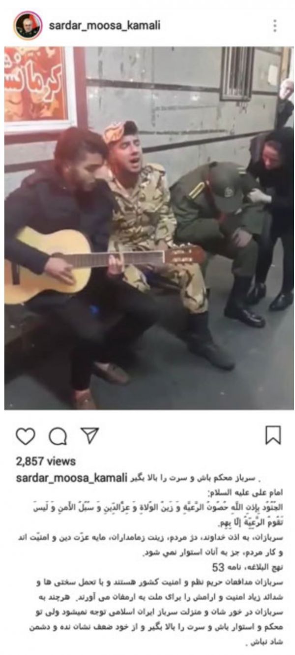 برترین ها : رئیس اداره سرمایه انسانی سرباز ستاد کل نیروهای مسلح به کلیپ منتشر شده از اجرای ترانه غمگین از سوی یک سرباز واکنش نشان داد.سردار موسی کمالی در واکنش به انتشار کلیپی از آواز خواندن غمگین یک سرباز که منجر به گریه کردن سرباز دیگری میشود در استوری اینستاگرام خود نوشت: سربازان مدافعان حریم نظم و امنیت کشور هستند و با تحمل سختی ها و شدائد زیاد امنیت و آرامش را برای ملت به ارمغان میآورند.