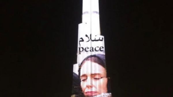 العربیه :به منظور قدردانی از خانم جاسدینا آردرن، تصویر کلمه «سلام» در بالای عکس نخست‌وزیر نیوزلند در حالی که حجاب روی سر دارد و یکی از بازماندگان حوادث خونبار مسجد نور در منطقه کرایست چرچ این کشور را در آغوش گرفته، روی برج خلیفه، بلندترین برج جهان در دبی نقش بست.