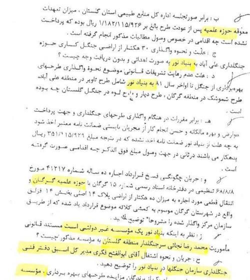 ۵. چرا و چگونه اجاره نامه ده ساله جنگل های گرگان به حوزه علمیه مورخ آبان ۶۸ فسخ و این جنگل ها به صورت قطعی به این حوزه علمیه سپرده شده؟