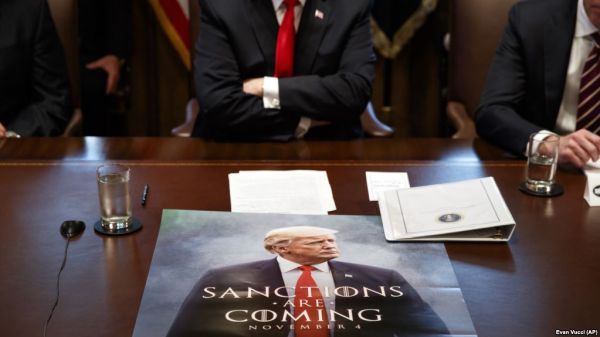 نمایش پوستر «تحریمها میآیند» در نشست کابینه ترامپ در دوم ژانویه ۲۰۱۹. این پوستر پس از اعلام بازگشت تحریمهای ایران در پاییز سال گذشته منتشر شد. رادیو فردا ،ایلان برمندولت دونالد ترامپ در حال افزایش فشار بر حکومت آیتاللههاست. کاخ سفید روز دوشنبه ۱۹ فروردین اعلام کرد سپاه پاسداران در فهرست گروههای تروریستی وزارت خارجه آمریکا در کنار گروههایی نظیر القاعده و «حکومت اسلامی» [داعش] قرار خواهد گرفت.