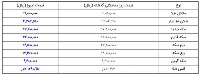 امروز شنبه ۲۴ فروردین ماه در بازار آزاد قیمت سکه و قیمت طلا نسبت به روز گذشته کاهش یافت و هر سکه تمام بهار آزادی طرح جدید ۴ میلیون و ۷۶۰ هزار تومان معامله شد.براساس اعلام اتحادیه طلا و جواهر امروز قیمت انواع سکه و طلا نسبت به پنجشنبه کاهش یافته است؛ برهمین اساس در بازار تهران سکه تمام بهار آزادی طرح جدید در قیمت ۴ میلیون و ۷۶۰ هزار تومان و سکه تمام بهار آزادی طرح قدیم با قیمت ۴ میلیون و ۶۰۰ هزار تومان معامله میشود.در بازار آزاد هر قطعه نیم سکه بهار آزادی ۲ میلیون و ۶۵۰ هزار تومان، ربع سکه هم با هزار تومان افزایش یکمیلیون و ۷۳۰ هزار تومان و هر قطعه سکه گرمی ۹۴۰ هزار تومان فروخته میشود.هر گرم طلای ۱۸ عیار هم ۴۳۸ هزار و ۶۰۰ تومان ارزشگذاری شده است، ضمن آنکه در بازارهای جهانی نیز هر اونس طلا ۱۲۹۰ دلار قیمت خورد.۴۵