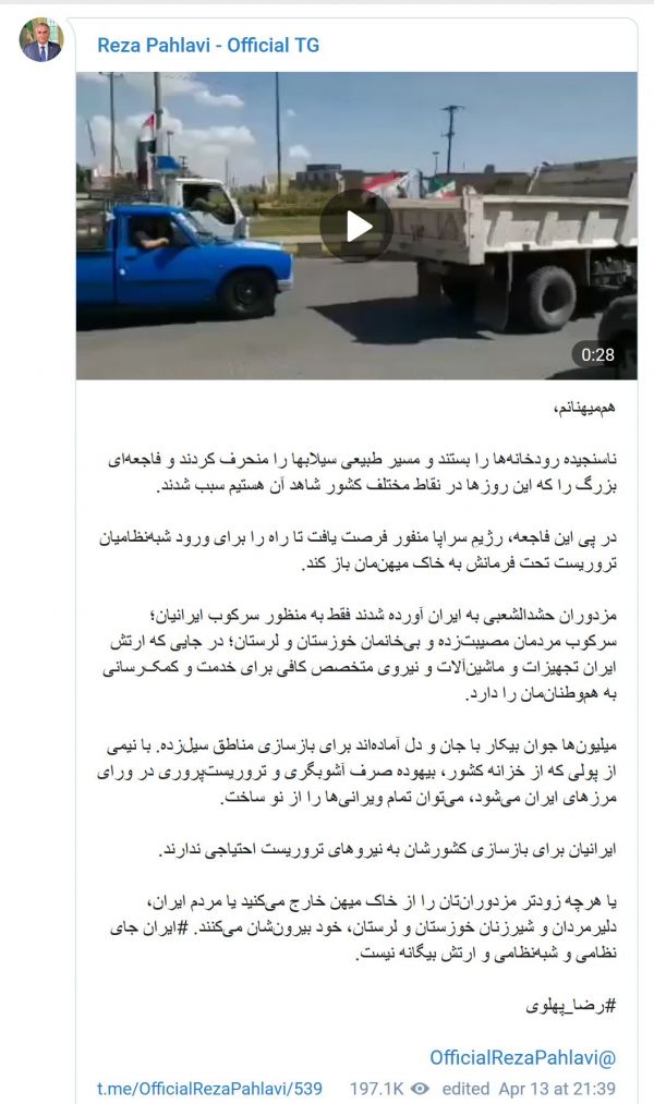 روز یکشنبه، شاهزاده رضا پهلوی، آخرین ولیعهد ایران و از چهرههای مخالف جمهوری اسلامی، نیز در پیامهای خود ورود شبهنظامیان مسلح از عراق را با مسئله «سرکوب» سیلزدگان معترض مرتبط دانست.
