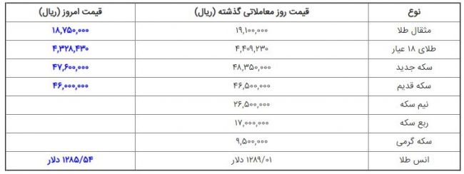هر گرم طلای ۱۸ عیار هم ۴۳۲ هزار و ۸۰۰ تومان ارزشگذاری شده است، ضمن آنکه در بازارهای جهانی نیز هر اونس طلا ۱۲۸۵ دلار قیمت خورد.۳۹