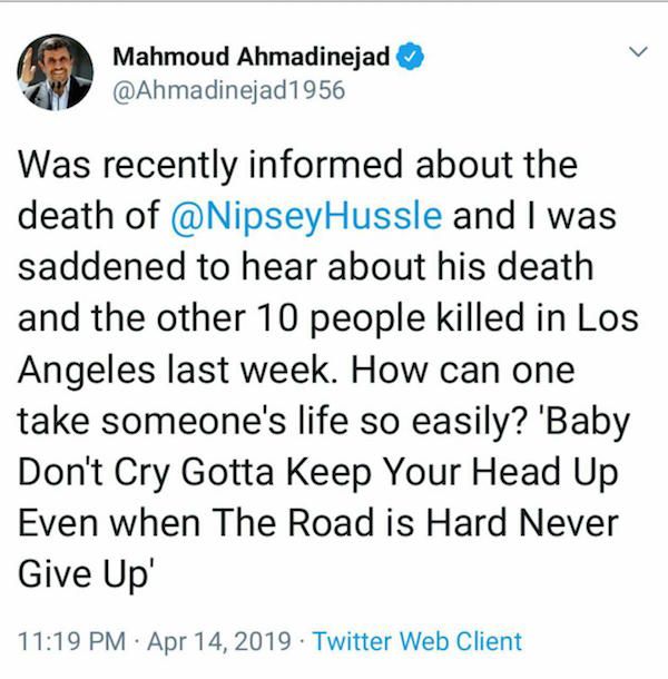 محمود احمدینژاد در حساب توییتر خود نسبت به قتل نیپسی هاسل، رپر آمریکایی ابراز تأسف و تألم کرد. نوشت: «چگونه میتوان زندگی شخصی را به این راحتی گرفت؟» این در حالی است که توییت احمدینژاد موجی از واکنشهای کاربران ایرانی و خارجی فضای مجازی را به همراه داشت.رییسجمهور پیشین ایران گفته از مرگ این رپر ۳۳ ساله و "ده نفر دیگر که هفته گذشته در لسآنجلس کشته شدند ناراحت شدم." احمدینژاد سپس در ادامه توییت خود بخشی از یکی از ترانههای توپاک شکور، رپر فقید آمریکایی را نقل کرده و نوشته: «عزیزم گریه نکن، سرت را بالا بگیر، حتی وقتی که جاده سخت است، هرگز تسلیم نشو.»