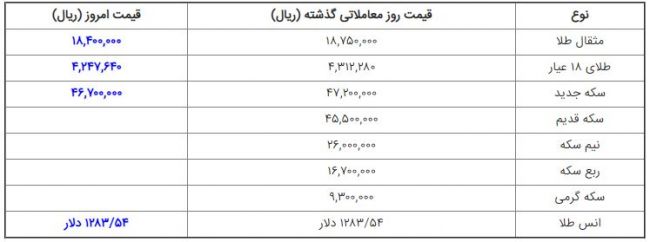 براساس اعلام اتحادیه طلا و جواهر امروز قیمت انواع سکه و طلا نسبت به سه‌شنبه کاهش یافته است؛ برهمین اساس در بازار تهران سکه تمام بهار آزادی طرح جدید در قیمت ۴ میلیون و ۶۷۰ هزار تومان و سکه تمام بهار آزادی طرح قدیم با قیمت ۴ میلیون و ۵۵۰ هزار تومان معامله می‌شود.