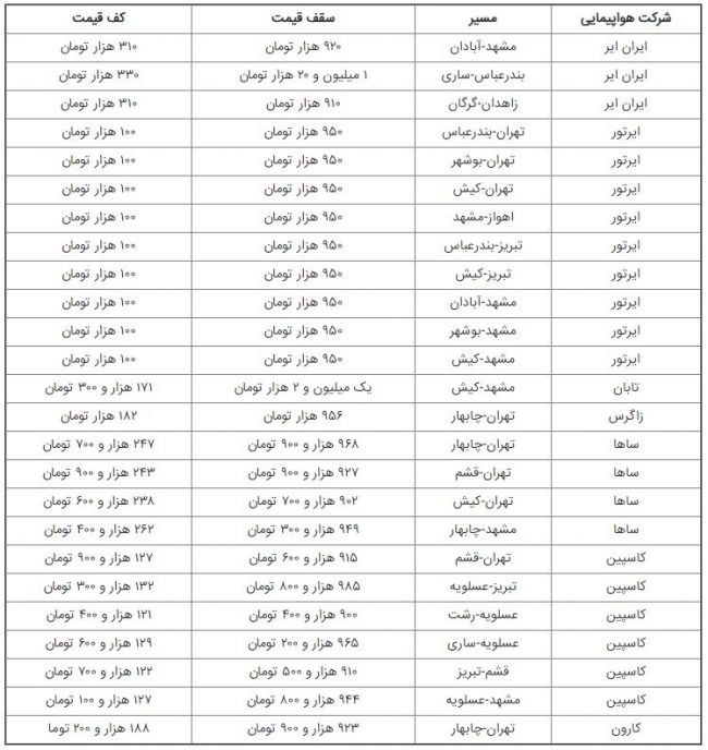 در حال حاضر دامنه نرخ بلیت پروازهای داخلی خطوط هوایی کشور که شامل سقف و کف قیمتها میشود، مطابق با با نرخهای مصوب آذرماه سال ۱۳۹۸ است، با این حال ۲۵ مسیر پروازی در داخل کشور توسط هفت شرکت هواپیمایی سقف قیمتی بالاتر از ۹۰۰ هزار تومان دارد و بالاترین سقف قیمت بلیت هواپیما در کشور رقمی معادل یک میلیون و ۲۰ هزار تومان است، رقمی که شاید خرید آن برای بسیاری از مردم عادی دست نیافتی است.