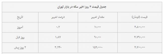 سکه در بازار امروز تهران، مانند روز قبل رشد قیمت را تجربه کرد. سکه که روز قبل تا 4,790,000 (چهار میلیون و هفتصد و نود هزار) تومان رسیده بود، امروز - پنجشنبه 29 فروردین 1398 مصادف با 18 آوریل 2019 - با رشد 0.2 درصدی به 4,800,000 (چهار میلیون و هشتصد هزار) تومان رسید.