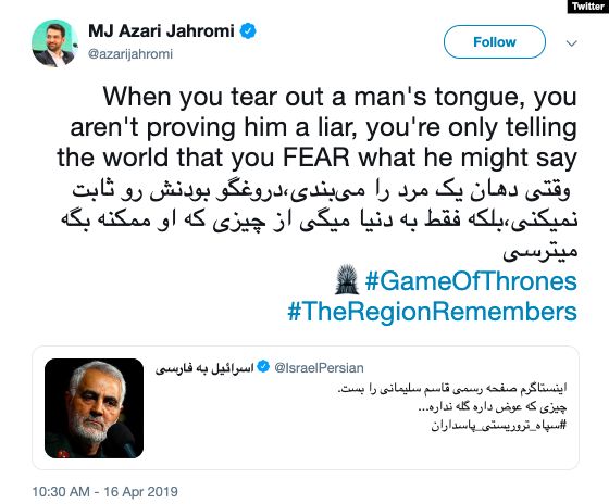 این هفته که موضوع بسته شدن حساب اینستاگرامی قاسم سلیمانی فرمانده نیروی قدس سپاه پاسداران مطرح شد، ابتدا صفحه توئیتر فارسی رسمی وزارت امور خارجه اسرائیل نوشت: «اینستاگرم صفحه رسمی قاسم سلیمانی را بست. چیزی که عوض داره گله نداره...» در اقدامی کم سابقه، وزیر ارتباطات جمهوری اسلامی با بازنشر توئیت وزارت خارجه اسرائیل نوشت: «وقتی دهان یک مرد را می‌بندی،دروغگو بودنش رو ثابت نمیکنی، بلکه فقط به دنیا میگی از چیزی که او ممکنه بگه میترسی»