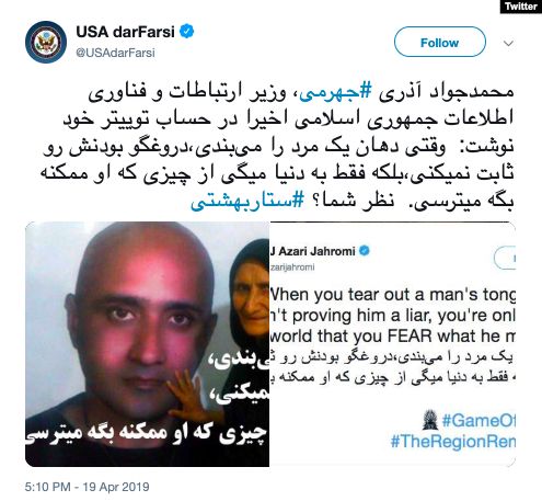 صفحه فارسی وزارت خارجه آمریکا در توئیتی نوشت: «محمدجواد آذری جهرمی، وزیر ارتباطات و فناوری اطلاعات جمهوری اسلامی اخیرا در حساب توییتر خود نوشت: وقتی دهان یک مرد را می‌بندی،دروغگو بودنش رو ثابت نمیکنی،بلکه فقط به دنیا میگی از چیزی که او ممکنه بگه میترسی. نظر شما؟ #ستاربهشتی»