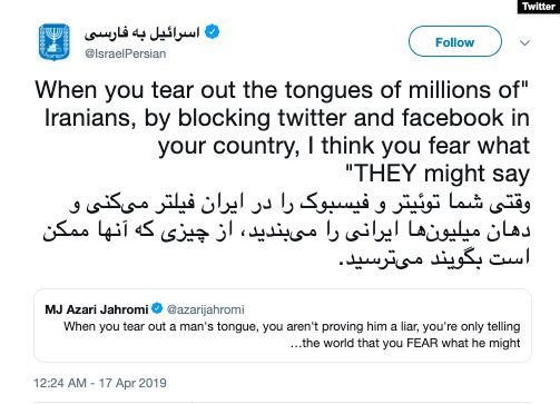 اما حساب توئیتر فارسی وزارت خارجه اسرائیل هم به نوعی دیگر جواب وزیر ارتباطات ایران را داد: «وقتی شما توئیتر و فیسبوک را در ایران فیلتر می‌کنی و دهان میلیون‌ها ایرانی را می‌بندید، از چیزی که آنها ممکن است بگویند می‌ترسید.»