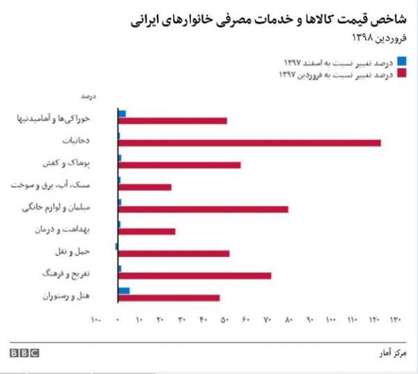 بنابر اعلام مرکز آمار ایران، نرخ تورم در گروه کالا و خدمات مصرفی در فروردین ماه امسال نسبت به همین ماه در سال گذشته (۱۳۹۷) نزدیک به ۴۵ درصد رسیده است. گوشت قرمز و ماهی، میوه و سبزیجات در این مدت دارای بیشترین تغییر قیمت بودهاند. به طور مثال قیمت هرکیلو گوشت گوسفند از حدود ۵۰ هزار تومان در فروردین سال گذشته به بالای صد هزار تومان رسیده است.