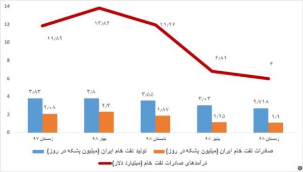 وضعیت تولید، صادرات و درآمدهای صادرات نفت خام ایران (بدون محاسبه میعانات نفتی) طی یک سال گذشته: