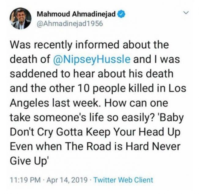 البته آنها با هم درباره موسیقی حرف زدند! توییت اخیر احمدینژاد درباره مرگ نپسی هاسل که به ضرب گلوله در آمریکا کشته شده بود، همچنان سوژه در پی دارد.