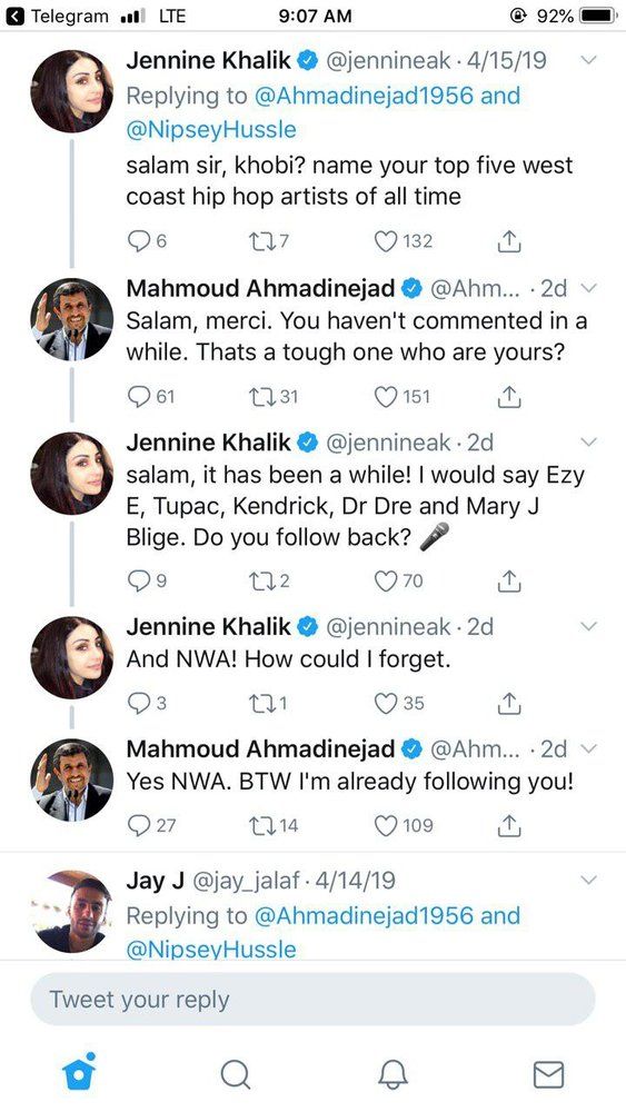این دیالوگ اکانت احمدینژاد است با جلین خلیک، دختر جوان روزنامهنگار فلسطینیالاصل که برای ایبیاس استرالیا مینویسد. او از سال ۲۰۰۹ در توئیتر به عنوان یک فعال اجتماعی علیه کشتار اشغالگران اسرائیلی توییت میکند اما احمدینژاد با او درباره علایقش درباره گروههای موسیقی رپ آمریکایی چت کرده و گفته کدام گروههایشان را میشناسد!جلین خلیک: «سلام محمود، خوبی؟ لطفا پنج رپر محبوبت در میان رپرهای آمریکایی را به من بگو.»