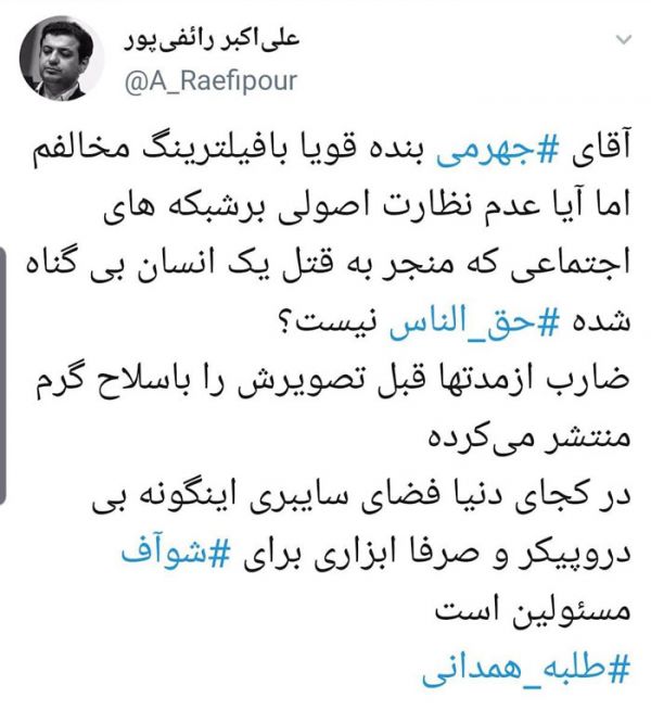 مشهورترین واکنش در این زمینه به توئیت علی اکبر رائفی پور، سخنران اصولگرا باز می‌گردد. او خطاب به وزیر ارتباطات نوشت: «آقای جهرمی بنده قویا بافیلترینگ مخالفم، اما آیا عدم نظارت اصولی برشبکه‌های اجتماعی که منجر به قتل یک انسان بی گناه شده حق الناس نیست؟ ضارب ازمدت‌ها قبل تصویرش را باسلاح گرم منتشر می‌کرده در کجای دنیا فضای سایبری اینگونه بی دروپیکر و صرفا ابزاری برای شوآف مسئولین است.»