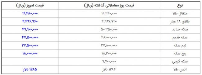 براساس اعلام اتحادیه طلا و جواهر امروز قیمت انواع سکه و طلا نسبت به یکشنبه کاهش یافته است؛ برهمین اساس در بازار تهران سکه تمام بهار آزادی طرح جدید در قیمت ۴ میلیون و ۹۹۰ هزار تومان و سکه تمام بهار آزادی طرح قدیم با قیمت ۴میلیون و ۷۵۰ هزار تومان معامله می‌شود.