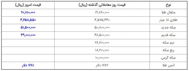 هر گرم طلای ۱۸ عیار هم ۴۶۸ هزار و ۵۰۰ تومان ارزشگذاری شده است، ضمن آنکه در بازارهای جهانی نیز هر اونس طلا ۱۲۸۱ دلار قیمت خورد.