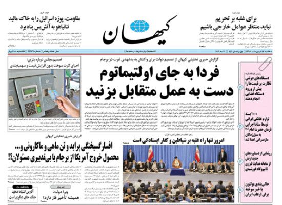 واکنش سه روزنامه اصولگرا حالا امروز سه شنبه روزنامه پر نفوذ کیهان از دولت تقاضا کرده است "برای حفظ اعتبار خود با اقدام عملی و نه صرفا بیانیه و اولتیماتوم معلوم نماید که حداقل خطوط قرمز ما، تحریم هاست و نه حفظ یکطرفه توافق به هر قیمت، در حالی که حتی اروپا نیز در عمل، کمترین اعتراضی به عهدشکنی سیستماتیک آمریکا نشان نمیدهد."