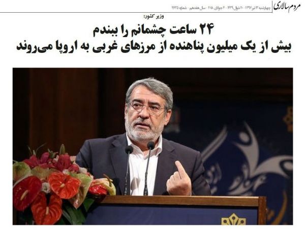 وزیر کشور دولت ایران تهدیدات خود را فقط معطوف به سیل مهاجرت و پناهندگی به اروپا نکرد و ادامه داد: بهعنوان هشدار میگویم ۲۴ ساعت چشمانم را رویهم میگذاشتم ۵۰۰۰ تن ماده مخدر از مرزهای ایران به سمت غرب میرفت.