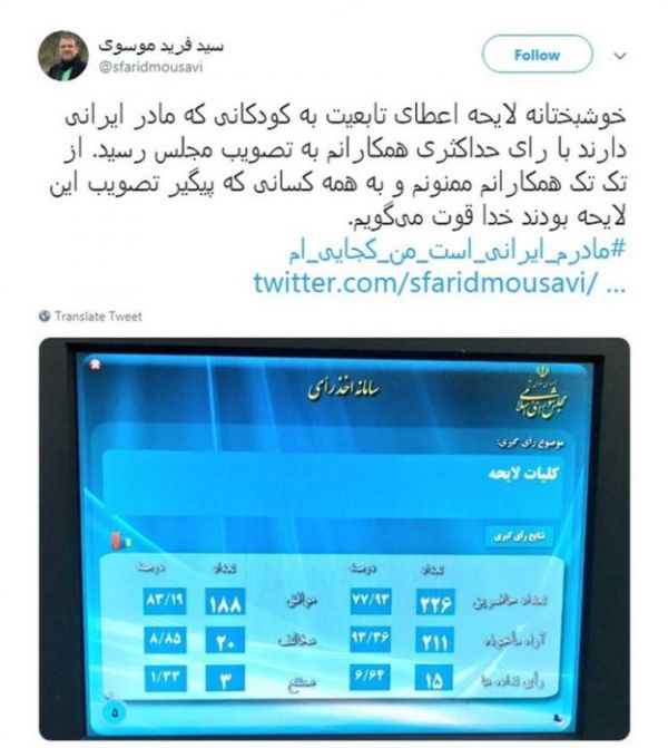 توییتر فرید موسوی نماینده تهران در مجلس محمود رحیمی جهانآبادی، نماینده تربت جام، در موافقت با این لایحه گفت که قانون فعلی که انتقال تابعیت را تنها از طریق پدر میداند، مربوط به سال ۱۳۱۳ و در دوره رضاخان تصویب شده و آن دوران را به "زمانی که زن را به عنوان یک کالا و وسیله در نظر میگرفتند" توصیف کرد و گفت: "بر اساس کدام منطق اعطای تابعیت یا انتقال خون از مادر به فرزند را رد و زن را از این حق محروم می کنید".مصطفی کواکبیان، نماینده تهران نیز در مخالفت با این طرح گفت: "اگر بدون برنامهریزی و حساب و کتاب عمل کنیم مشکلاتی خواهیم داشت، بعضی در تشریح این موضوع، مبحث شرعی بودن ازدواج زنان را مطرح می کنند در صورتی که این موضوعی حقوقی است".