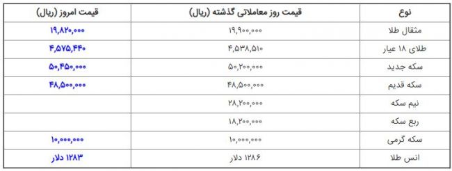 براساس اعلام اتحادیه طلا و جواهر امروز قیمت انواع سکه و طلا نسبت به یکشنبه کاهش یافته است؛ برهمین اساس در بازار تهران سکه تمام بهار آزادی طرح جدید در قیمت ۵ میلیون و ۴۵ هزار تومان و سکه تمام بهار آزادی طرح قدیم با قیمت ۴ میلیون ۸۵۰ هزار تومان معامله میشود.