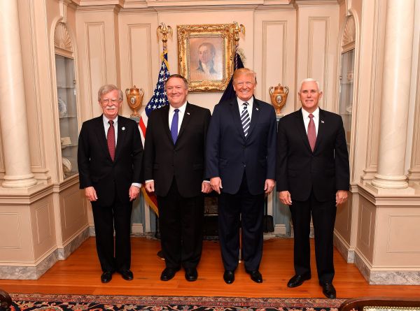 در حال حاضر جان بولتون و مایک پومپئو ، ستونهای اصلی سیاست خارجی ترامپ هستند مجموعه این مواضع به کلی به آنچه دونالد ترامپ در تبلیغات و سخنرانیهایش گفته و وعده داده یا گاه به آن عمل کرده مخالف است.