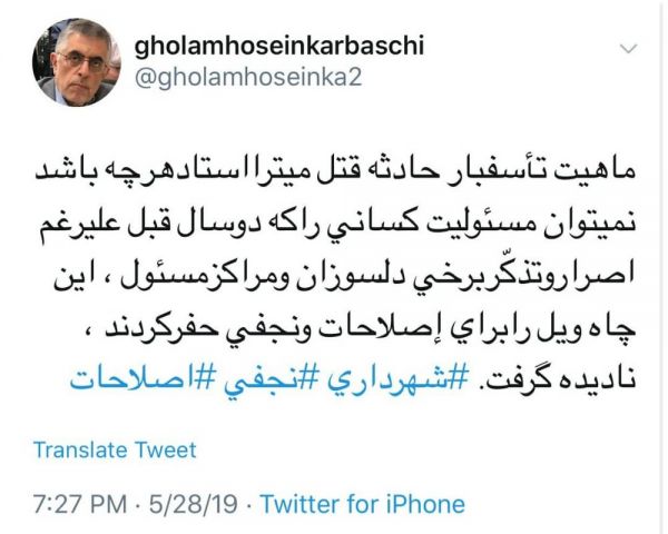 به گزارش خبرآنلاین، غلامحسین کرباسچی در توئیتی به ماجرای قتل همسر دوم محمدعلی نجفی شهردار سابق تهران اشاره کرده و نوشته است؛ ماهیت تاسفبار حادثه قتل میترا استاد هرچه باشد نمی توان مسئولیت کسانی را که دو سال قبل علیرغم اصرار و تذکر برخی دلسوزان ومراکز مسئول، این چاه ویل را برای اصلاحات و نجفی حفر کردند نادیده گرفت.