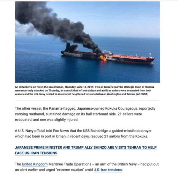 •     بلافاصله عباس موسوی، سخنگوی وزارت خارجه ایران اعلام کرد حوادث نفتکش‌های مرتبط با ژاپن همزمان با دیدار آبه با رهبر ایران "مشکوک" است.