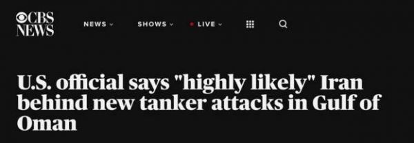 بازتاب حملات به نفتکش‌ها در رسانه‌های آمریکا؛ سی بی اس: یک مقام پنتاگون حملات را به ایران نسبت داد شبکه خبری سی بی اس آمریکا می گوید یک مقام وزارت دفاع آمریکا به دیوید مارتین گزارشگر ارشد امور امنیتی این شبکه گفته از نظر او "به احتمال بسیار زیاد ایران پشت حملات امروز (پنجشنبه) به دو نفتکش در دریای عمان" بوده است.