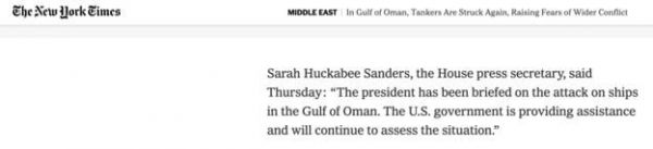 از جمله وزیر خارجه آمریکا که مدعی شده بر اساس ارزیابی های اطلاعاتی نهادهای نظامی این کشور به نوع سلاح و روش مورد حمله قرار گرفتن این دو نفتکش پی برده و این که ایران را پشت این حملات می داند.