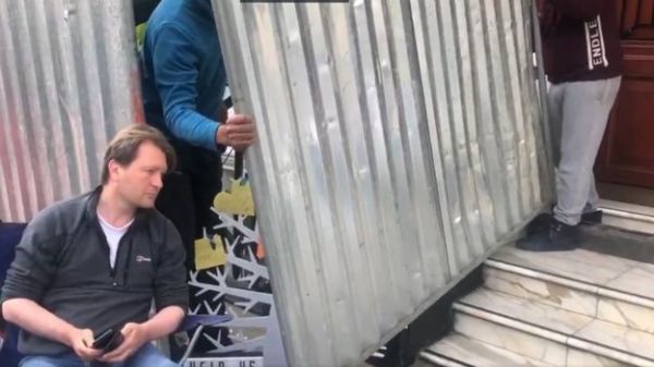 ویدئوهایی که در شبکه های اجتماعی وجود دارد نشان می دهد زمانی که آقای رتکلیف در پیادهروی جلوی ساختمان سفارت نشسته بود، افرادی پشت او را با ورقه های فلزی می پوشانند. برخی از وسایل او از جمله یک درخت تزئینی کوچک که یادداشت هایی به یاد فرزند خردسال و همسر زندانیاش روی آن نوشته شده بود، پشت ورقه های فلزی محصور و از دید و دسترس خارج شد.