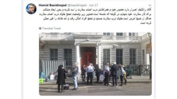 حمید بعیدی نژاد، سفیر ایران در لندن از این اعتراض جلوی ساختمان سفارت چند بار در حساب توییترش انتقاد کرده و گفته آقای رتکلیف ورود و خروج افراد را از ساختمان "غیرممکن" کرده است. در قوانین بریتانیا، اعتراض مسالمتآمیز شهروندان به رسمیت شناخته شده است.