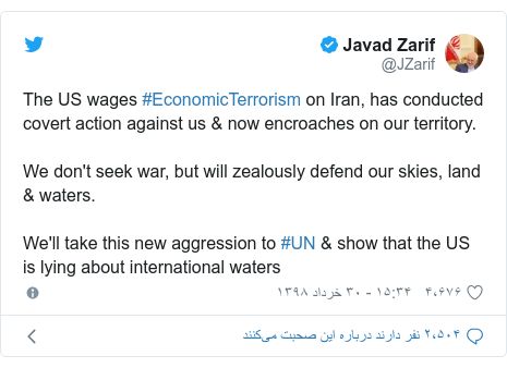 آقای ظریف در توییتر نوشت: "آمریکا علیه کشور ما به تروریسم اقتصادی روی آورده، و علیه ما دست به عملیات مخفی می‌زند و حالا به خاک ما تجاوز کرده. ما به دنبال جنگ نیستیم اما با تعصب از زمین و آسمان و دریایمان محافظت می‌کنیم."