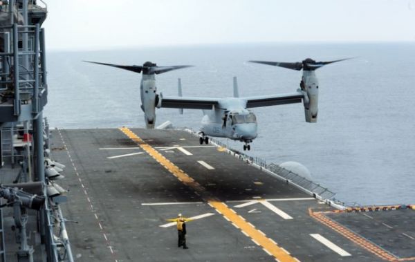 یک هواپیمای عمود پرواز آسپری روی ناو یو اس اس باکسر فرود می آید. این ناو که از اقیانوس هند به سمت خلیج فارس حرکت کرد، جایگزین ناو یو اس اس کیرسارج میشود.ایالات متحده پیشتر در پی افزایش تنش با ایران در خلیج فارس ناو هواپیمابر آبراهام لینکلن و ناوهای همراه آن را منطقه اعزام کرده بود.