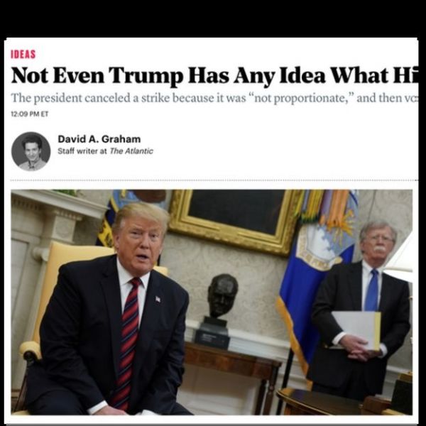 دیوید ای. گراهام در نشریه آتلانیک که از منتقدان دونالد ترامپ است نوشته: "روز جمعه رئیس‌جمهور گفت که حمله هوایی را تنها ۱۰ دقیقه مانده به وقوع لغو کرده" چون آن را متناسب با ساقط کردن پهپاد نیافته و "حالا روز سه‌شنبه که (حسن) روحانی به "مدل ترامپی" به تحریم‌های جدید واکنش نشان داده رئیس‌جمهور می‌گوید هرگونه حمله به منافع و متعلقات آمریکا با پاسخی قدرتمند و کوبنده همراه خواهد بود که در مواردی با نابودی کامل همراه خواهد بود."
