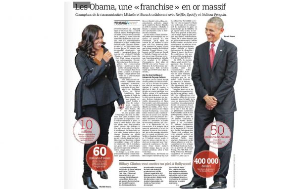 به گزارش روزنامه لوفیگارو فرانسه، باراک اوباما و همسرش میشل پس از پایان دوره ریاست جمهوری فعالیت های سودآوری را در زمینه های مختلف از جمله سخنرانی، انتشارات، همکاری با نتفلیکس و ... آغاز کرده اند و اکنون ثروت آنها از صد میلیون دلار فراتر رفته است.