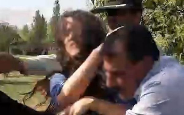 این مامور سپس دختر جوان را در حالی که لباس‌هایش بر اثر خشونت مامور کنار رفته، بغل کرده و با ضرب و شتم به زور سوار یک خودروی نیروی انتظامی می‌کند.