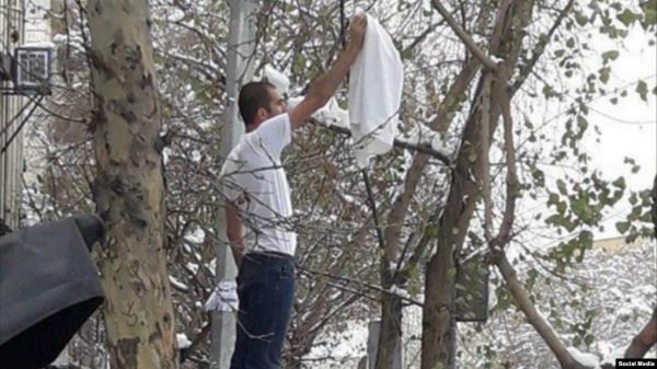 تصویر آرشیوی از اعتراض نمادین یک مرد به حجاب اجباری در خیابان انقلاب تهران در حالی که برخورد با مخالفان حجاب اجباری در ایران شدت یافته است، این بار رئیس بسیج زنان ایران گفت که مردان هم ملزم به رعایت حجاب هستند.
